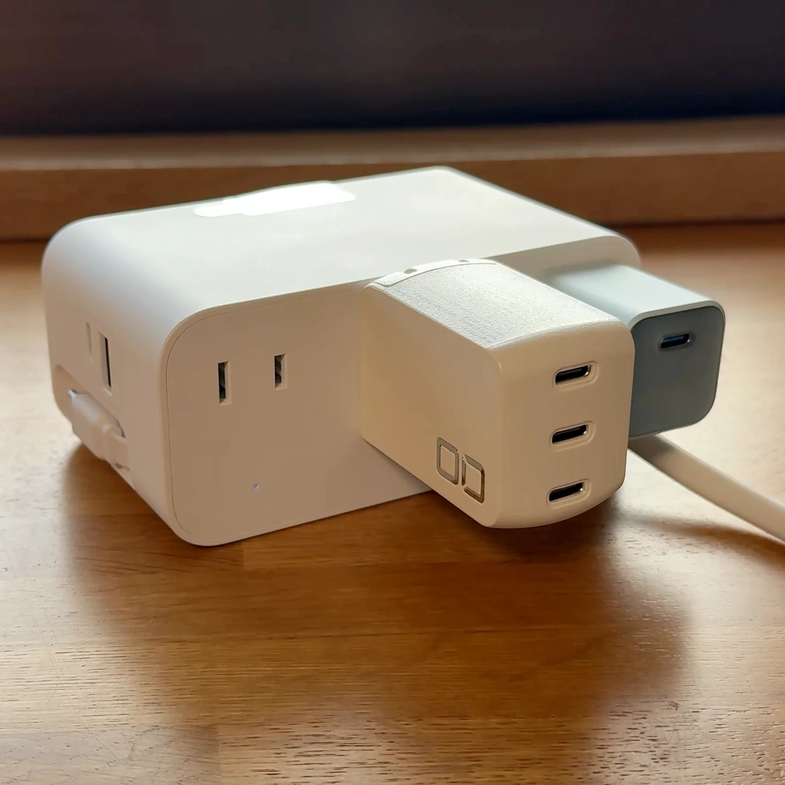 さらに、本体裏面には3つのコンセントがあるので、100Wクラスの充電をそこから取りたい時や、デスク周りのモニターだったり照明だったり、その他家電の電源もそこから取ることができるので、デスク周りのコンセント事情もこれ1つで解決できるアイテムと言えるでしょう。